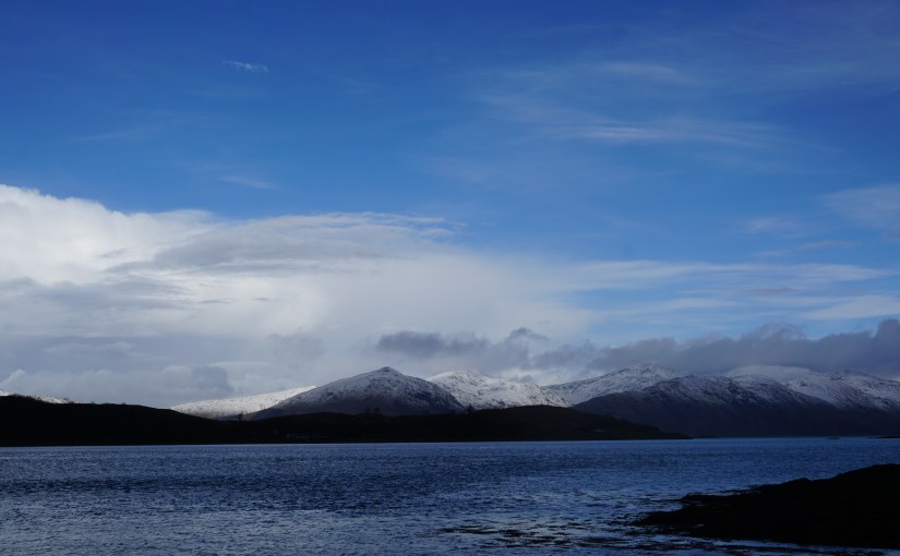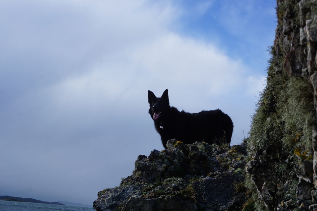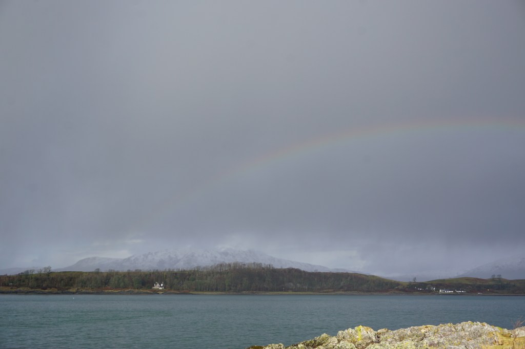I admitted defeat, putting my gear back into my bag and hurled it over my shoulder, calling a now very sodden Roscoe to my side. In true Shepherd fashion he cried up at me, wanting to get up and moving again. He hates me being stationary for more than five seconds. I treaded over seaweed and wet rocks, and gave a final look over my shoulder to see the rain had just about cleared for a striking rainbow to curl itself over the island opposite.