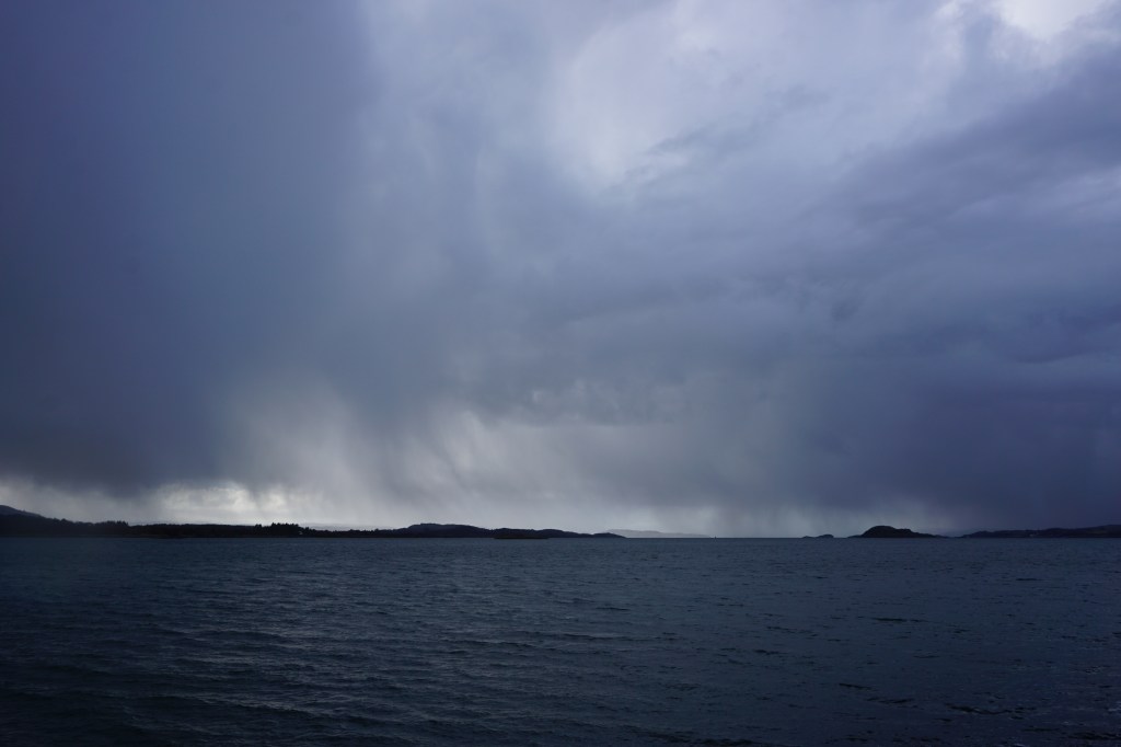 Any attempts to take pictures of anything seemed futile. The light wasn’t the best and the dark clouds seemed to be crawling closer. Sheet rain fell over the smaller islands on the horizon. To my left, a male Shell duck bolted over the black sea, but my camera lens was spotted with rain and wind and so the duck was all but a white blob against other rain blobs that had started to now fall.
